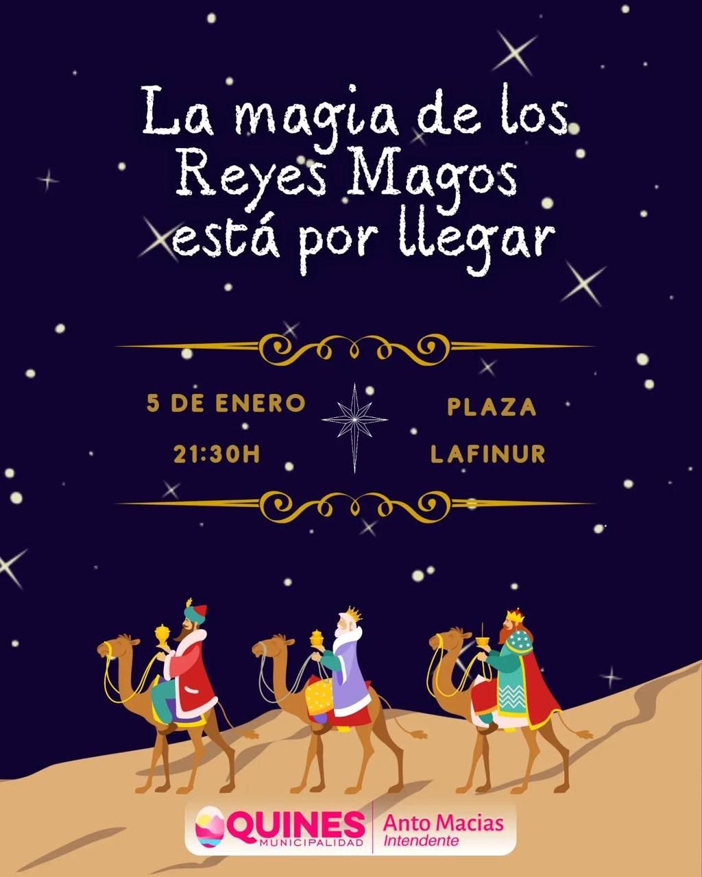 La Municipalidad de Quines, bajo la gestión de la intendente Macías, organizó un encuentro especial con Gaspar, Melchor y Baltasar en Plaza Lafinur. El evento será el lunes 5 de enero a las 21:30 horas.