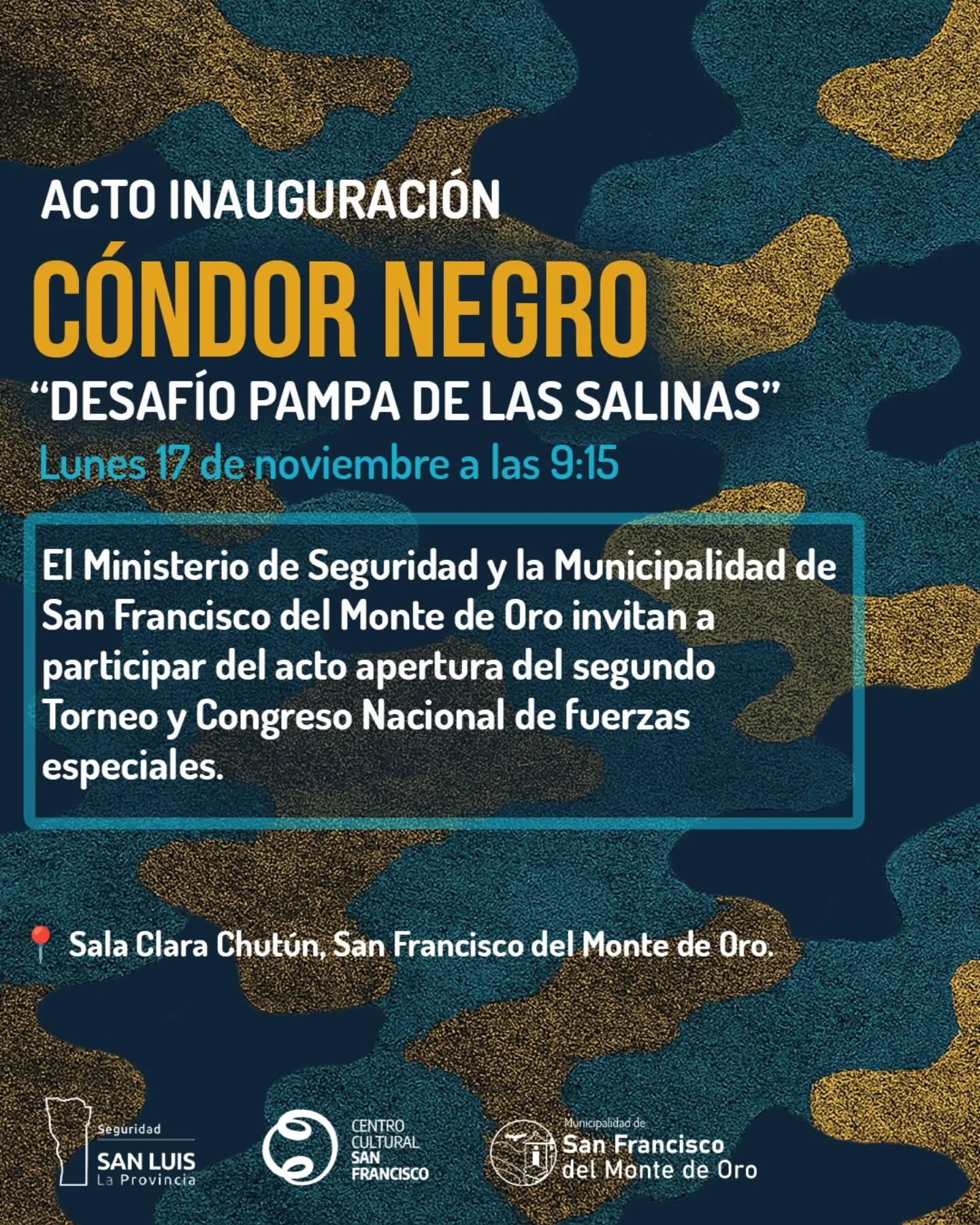 San Luis será nuevamente protagonista de uno de los eventos más importantes del ámbito de las fuerzas especiales del país. Del 17 al 21 de noviembre se llevará a cabo el 2° Congreso y Torneo de Fuerzas Especiales “Cóndor Negro”, esta vez bajo la nominación “Desafío Pampa de las Salinas”.